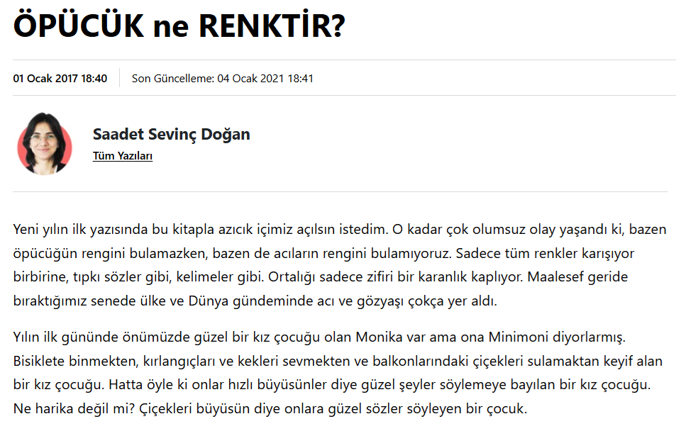 Basından Haberler ÖPÜCÜK ne RENKTİR? Saadet Sevinç Doğan, Kocaeli Barış Gazetesi, 01.01.2017 Haberi okumak için görselin üzerine tıklayınız. Paylaş Tweet et