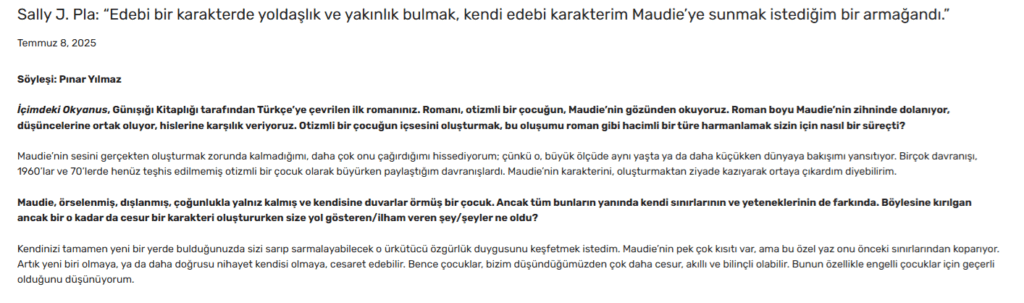 Sally J. Pla: “Edebi bir karakterde yoldaşlık ve yakınlık bulmak, kendi edebi karakterim Maudie’ye sunmak istediğim bir armağandı.”