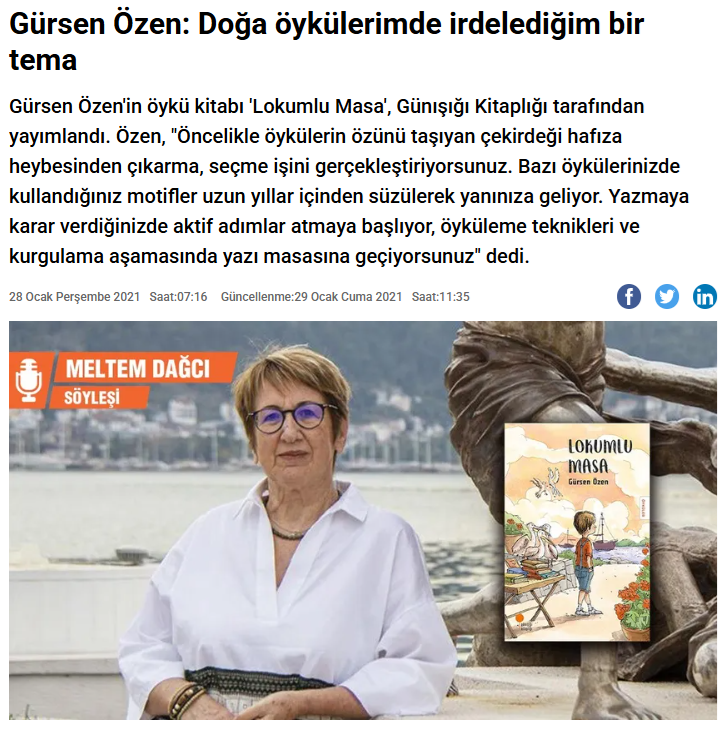 Basından Haberler Gürsen Özen: Doğa Öykülerimde İrdelediğim Bir Tema Meltem Dağcı, Gazete Duvar, 29.01.2021 Haberi okumak için görselin üzerine tıklayınız. Paylaş Tweet et